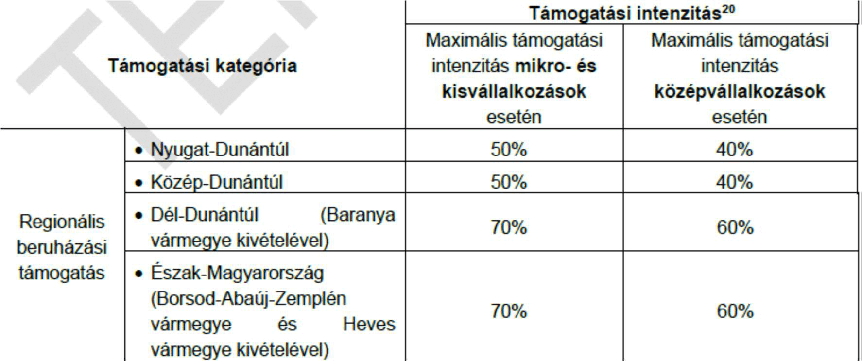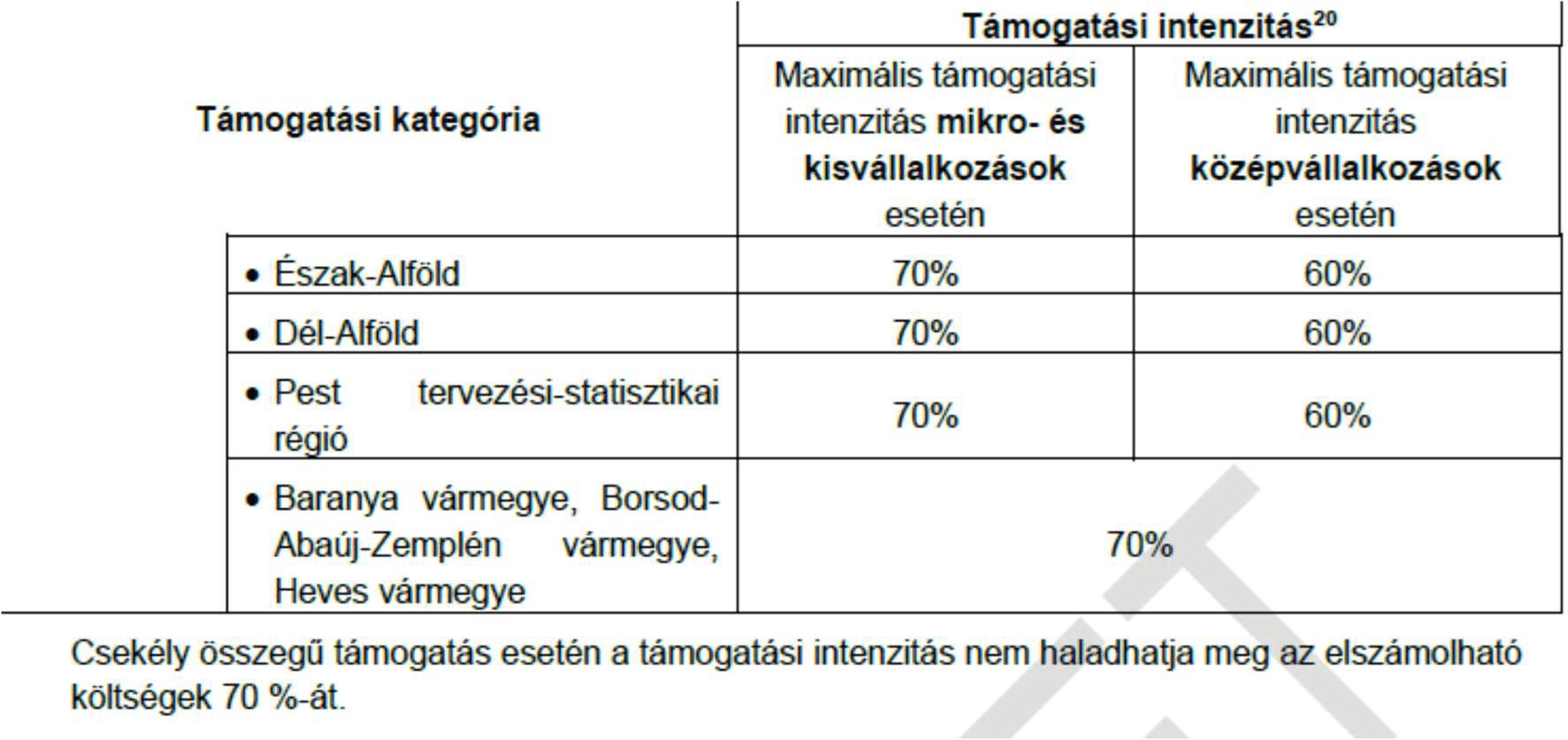 A támogatás vissza nem térintendő támogatás. A támogatás mértéke az elszámolható költségek értékének 40-70 % lehet függően a megvalósítási helyszíntől és vállalkozás méretétől.
