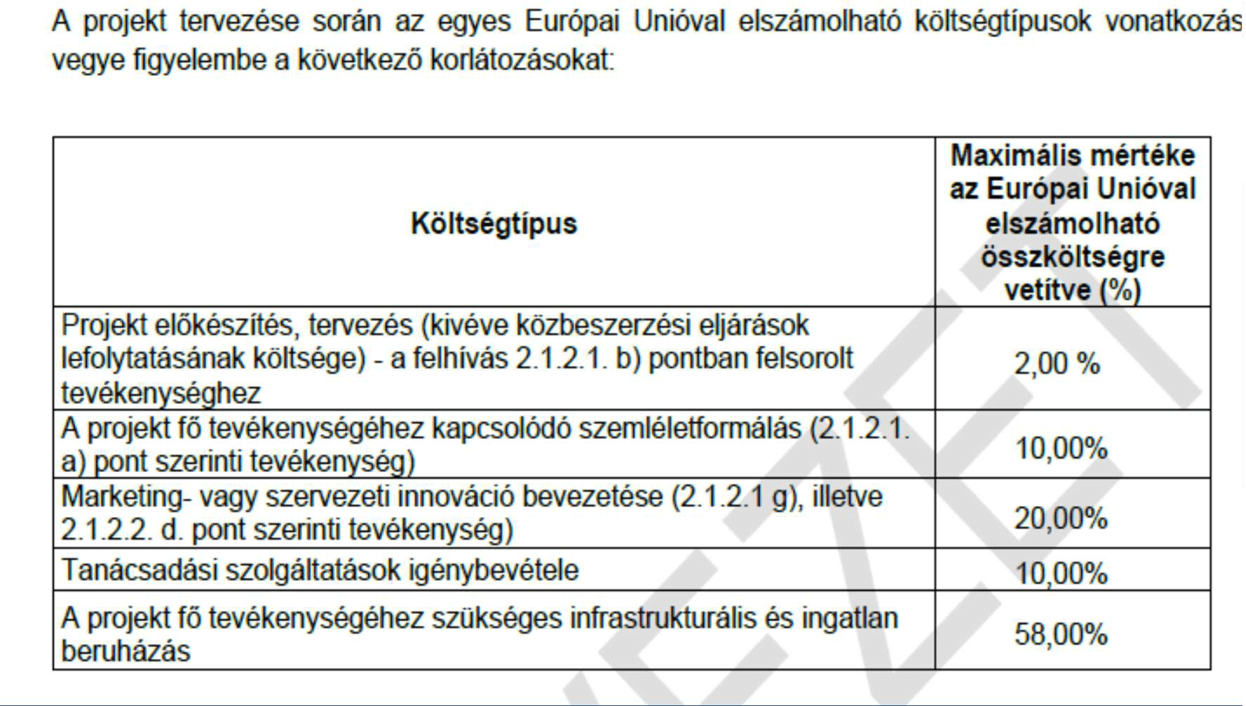 II.5.) Terület előkészítés – A terület-előkészítés összes elszámolható költsége nem haladhatja meg az Európai Unióval elszámolható összköltség 2%-át.
